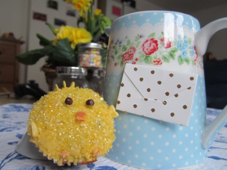 Jede Menge Nester und Hasen überall, ich möchte jetzt auch mal ein Küken sehen. Als ich den Muffin verziert habe ist mir aufgefallen, dass ich Stadtkind überhaupt nicht weiß, welche charakteristischen Merkmale ein Küken hat. Außer flauschig sein und dem Schnabel. Also habe ich „Chicken-Cupcake“ gegoogelt. Und es gab überraschend viele Bilder mit frittierten Hühnchenbeinen auf dem Icing von Cupcakes. Klingt total eklig, aber hey – manche Kombinationen sind in der Theorie so falsch und im Mund so richtig! 🙂