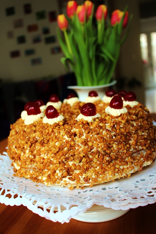 4.) Komplett mit Buttercreme umhüllen und den Krokant außen rum auftragen. Am besten macht ihr das mit ordentlich gewaschenen Händen, dann könnt ihr es gut andrücken.