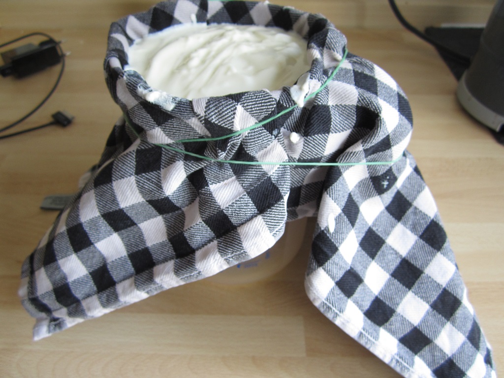1.) Ein sauberes Küchentuch mit Gummis über eine Schüssel oder ein großes Glas spannen. Den Joghurt hinein füllen und abgedeckt über Nacht stehen lassen. Der Joghurt verliert so viel Flüssigkeit. Strenggenommen ist er damit nicht mehr 0,1 %ig, aber wir wollen mal nicht so kleinlich sein – ist aus jeden Fall immer noch wenig Fett.
