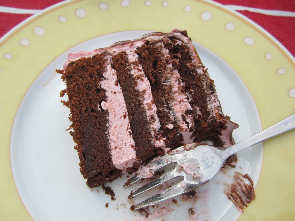 6.) Mit einem langen Messer (denn der Spaten ist wirklich das Einzige, was in der Küche noch dringend fehlt!) die Creme gleichmäßig verteilen und die nächste Schicht aufsetzen, bis alle vier Schichten getürmt sind.