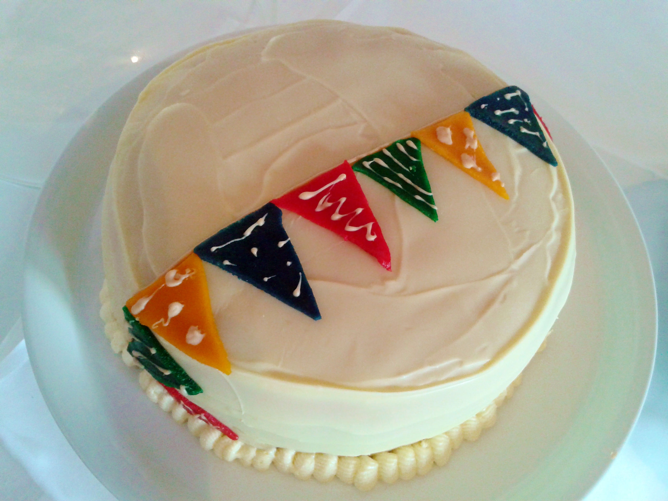 3.) Die weiße Schokolade erwärmen und in eine kleine Spritztülle geben. Mit ruhiger Hand in einem Zug einen Streifen quer über den Kuchen ziehen, auch über den Rand. Hier werden die Wimpel dran hängen.