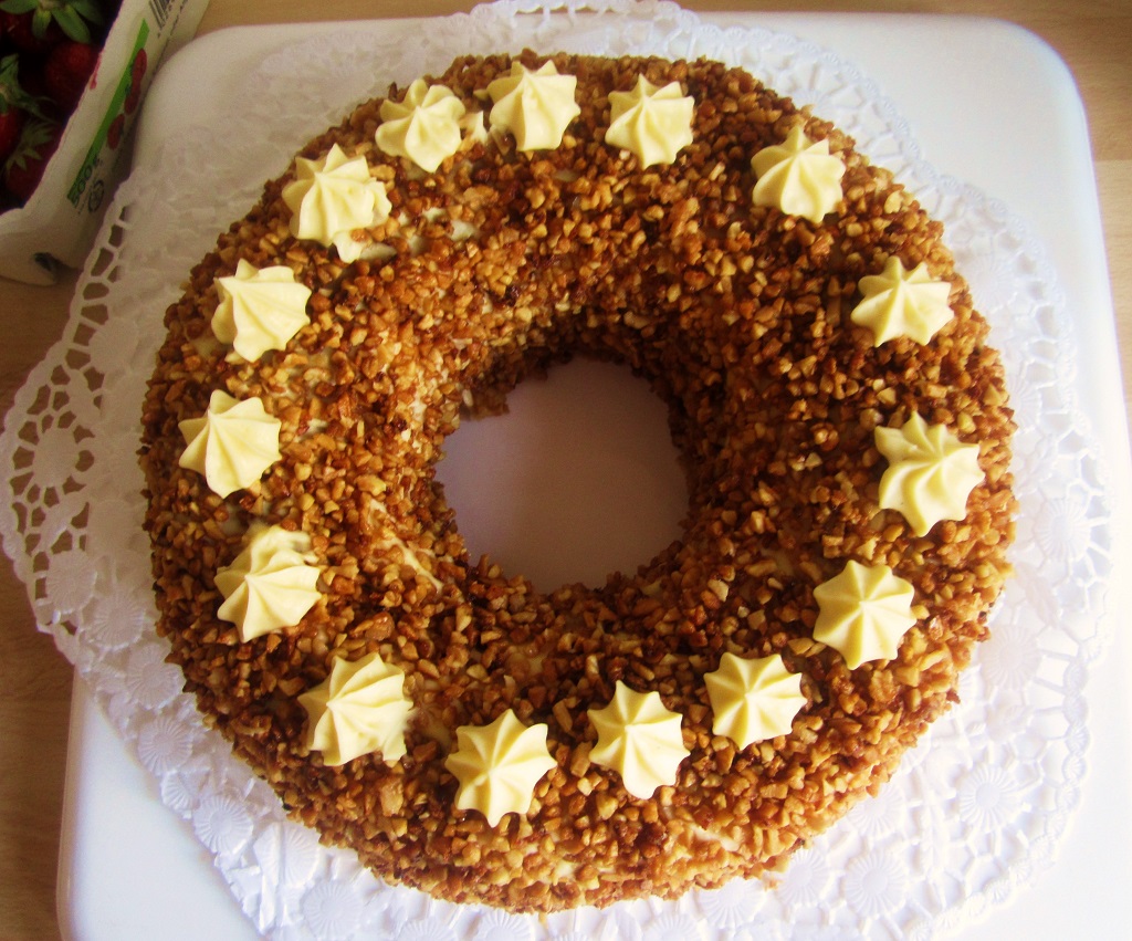 5.) Komplett mit Buttercreme umhüllen und den Krokant außen rum auftragen. Am besten macht ihr das mit ordentlich gewaschenen Händen, dann könnt ihr es gut andrücken.