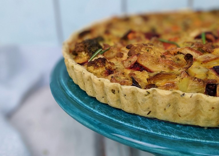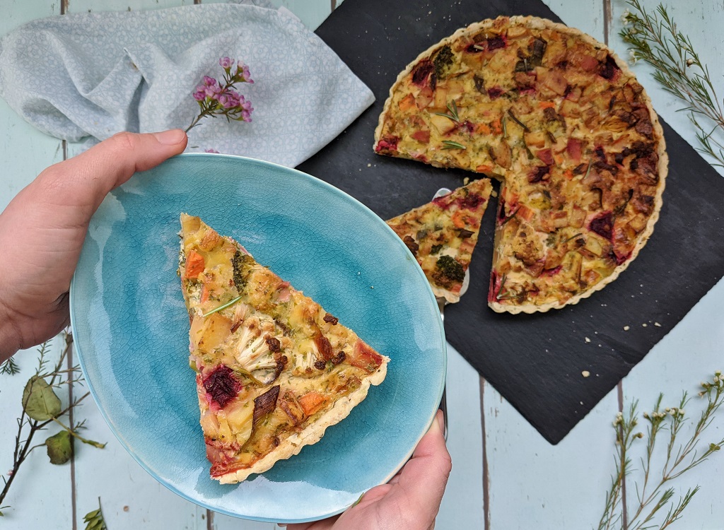 (English) In unserer Familie ist es Tradition, dass bei Festen (oder einfach beim Brunch) jeder etwas für das Buffet mitbringt. Da es allerdings einige leidenschaftliche Bäcker*innen in unserer Runde gibt, haben wir am Ende immer viel zu viel Kuchen und da dachte ich mir neulich so -ach komm, mach doch mal was Herzhaftes! Das Ergebnis ist diese bunte vegetarische Quiche (mit der ich übrigens auch im ZDF-Format „Küchenträume“ zu sehen war), mit einem leckeren Rosmarin-Boden und viel frischem Gemüse. Diese Quiche eignet sich ganz wunderbar für solche Anlässe, denn sie schmeckt lecker – ob warm oder kalt und ist super einfach zum Vorbereiten. Wir machen diese Quiche besonders gerne, wenn wir Gemüsereste zu verbrauchen haben. Ihr könnt das Rezept ganz nach eurem Geschmack variieren, zum Beispiel indem ihr die Karotten durch Pastinaken ersetzt, die Kartoffeln durch Kürbis oder den Brokkoli durch Pilze – nehmt was euch schmeckt.