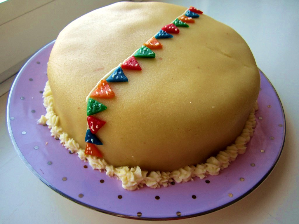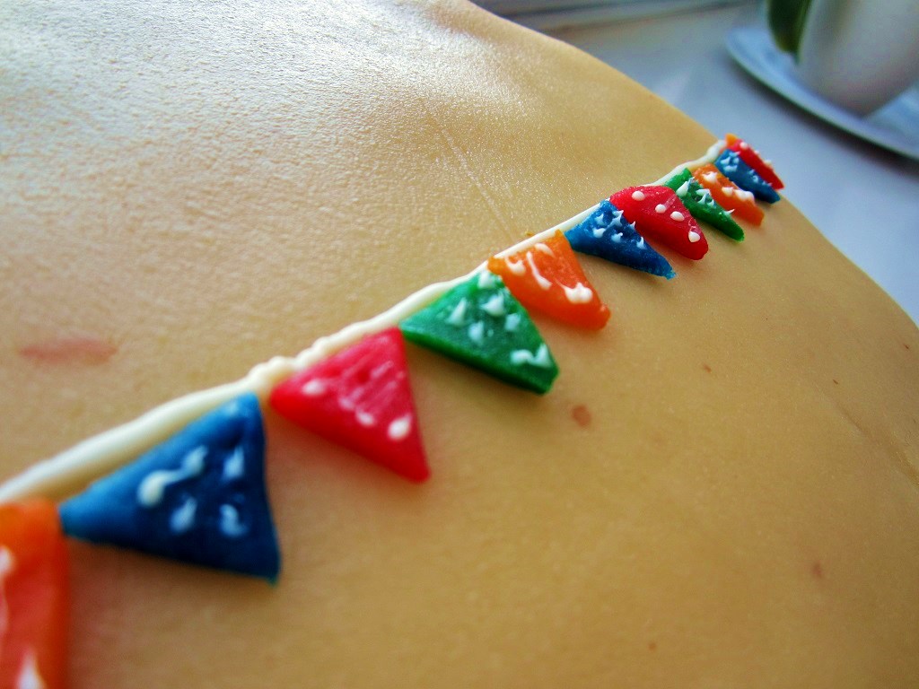 4.) Decide the colour-order and start applying the bunting to the cake. Marzipan sticks lovely on marzipan but if it cases any trouble just use a tiny bit of water as extra-glue.