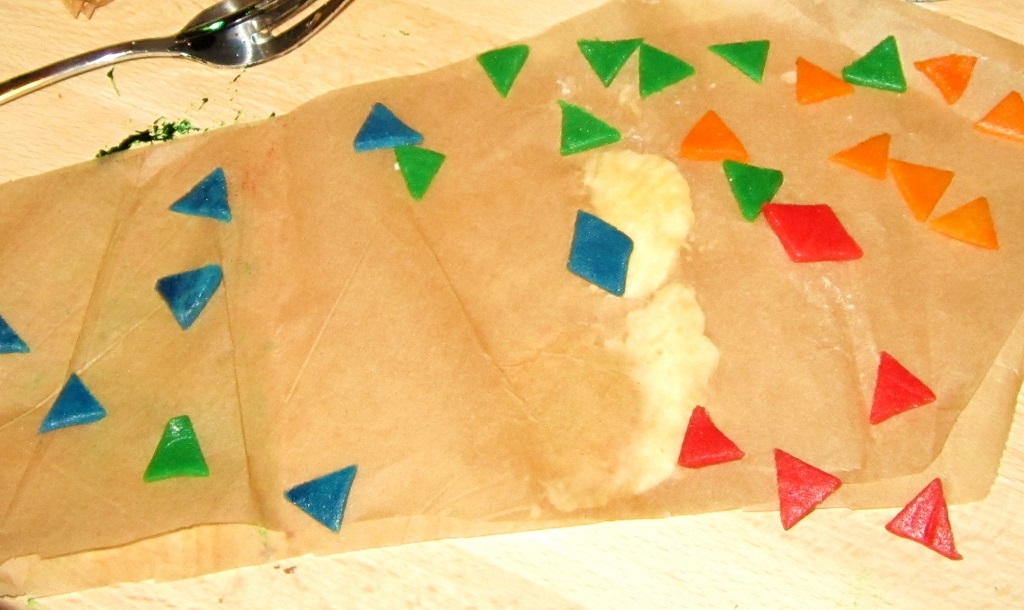 2.) Roll out your marzipan (using grease/baking paper) and cut triangles of an even size with a sharp knife.