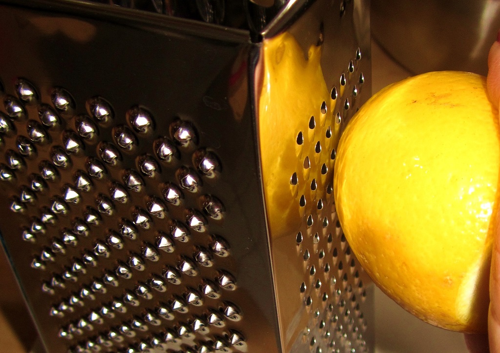4.) Wash your lemons with hot water and grate the yellow peel off them with a fine cheese grater. Now squeeze the juice out of the lemons. Add the juice and half of the peel to the batter (you’ll need the other half for the cream cheese frosting). Carefully ass the egg-mix and only stir until everything is mixed. Do not over mix.