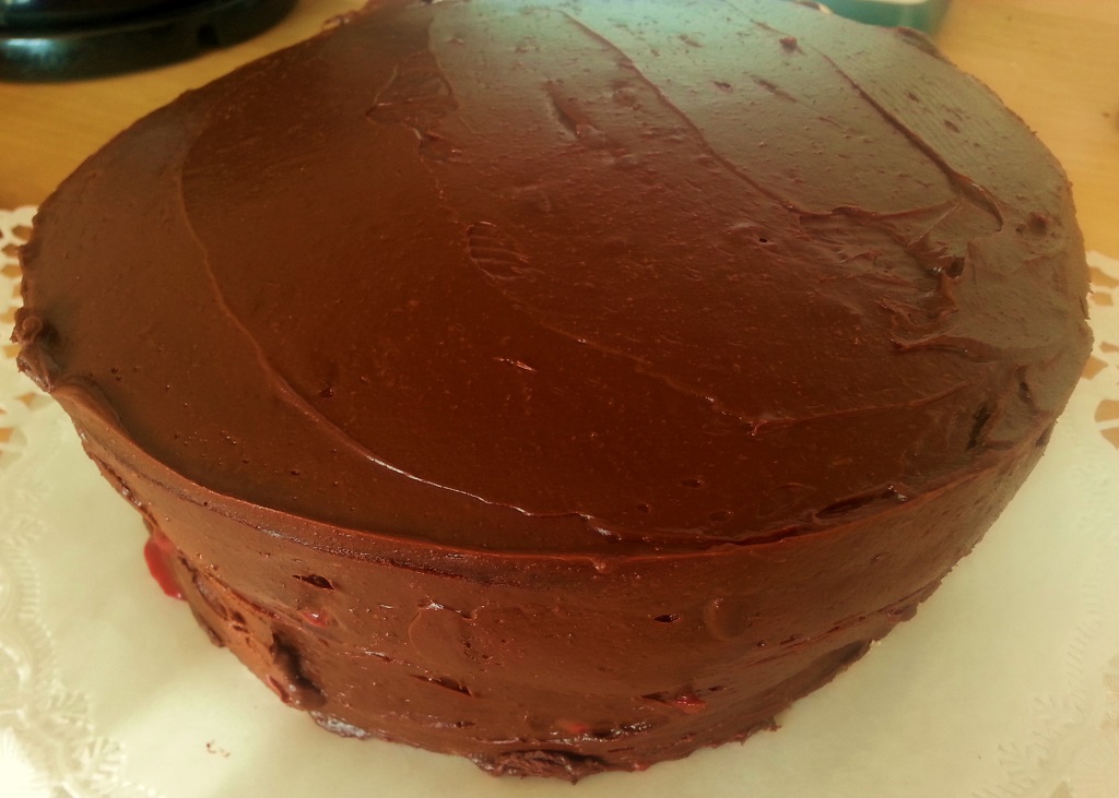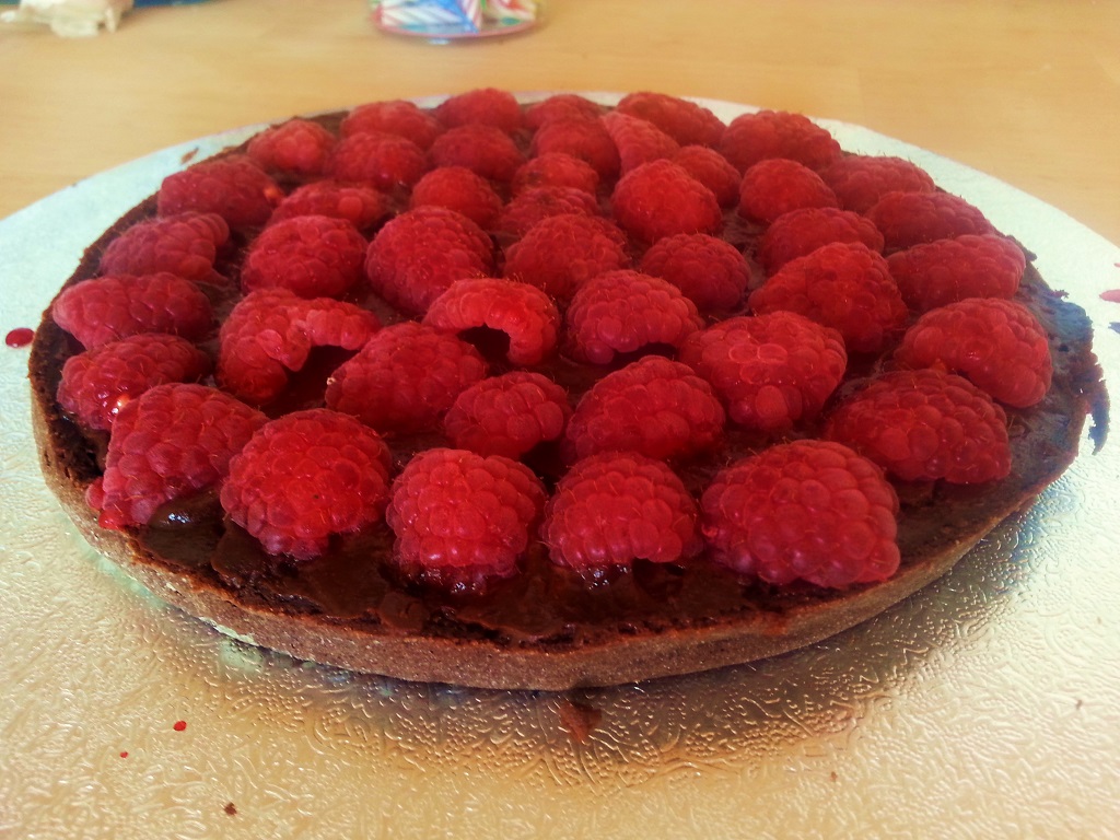 3.) Die Unterseite des zweiten Tortenbodens ebenfalls mit Ganache einschmieren und auf die Himbeeren setzen. Dient als Kleber, damit das ganze nicht rutscht. Auf die jetzt oben liegende Seite wiederrum großzügig Ganache auftragen und mit der zweiten Hälfte Himbeerhälften ganieren. Die letzte Platte wieder von unten bestreichen und aufsetzen. Euer Gebilde sieht nun so und noch nicht so schön aus: