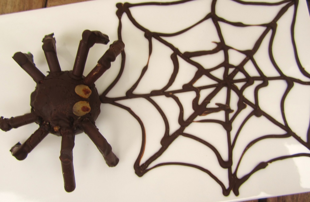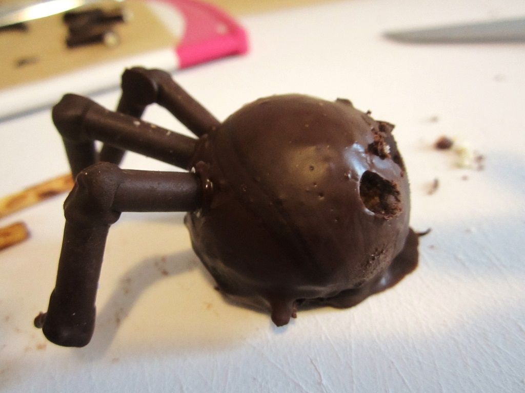 Die Spinnen haben einen Körper aus Kuchen (Cake-Pop) und die Beine sind Mikados. Ich hatte kurz überlegt, ob ich nicht einfach eine Lakritze-Schnecke aufrolle und darauf die Beine mache, aber ich ess einfach nicht so gern Lakritze in meinem Kuchen. Wer es also mag, hätte damit eine Methode. Besser sieht es mit Mikados trotzdem aus.