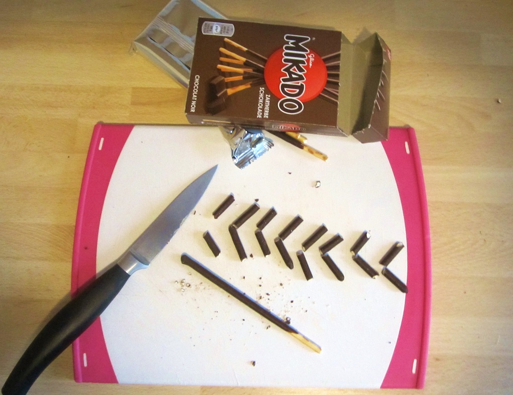 2.) Beine: Mikado-Stangen klein schneiden (pro Stange 3-4 Stücke). Mit flüssiger Schokolade immer zwei aneinander kleben. Auf Backpapier gut trocknen lassen.