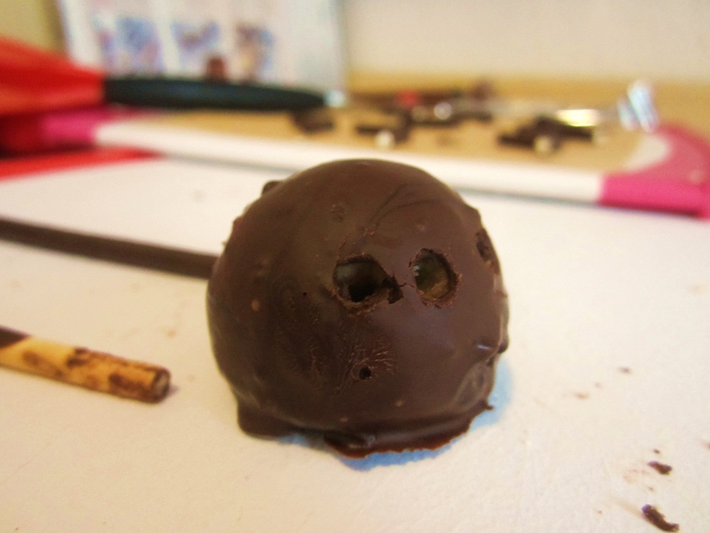 5.) Die Beine mit etwas Schokolade in die Löcher kleben. Wieder kalt stellen. Zuckeraugen mit Schokolade festkleben (oder Marzipan-Augen kleben von alleine). Fertig! Bäh. Mhmmm.