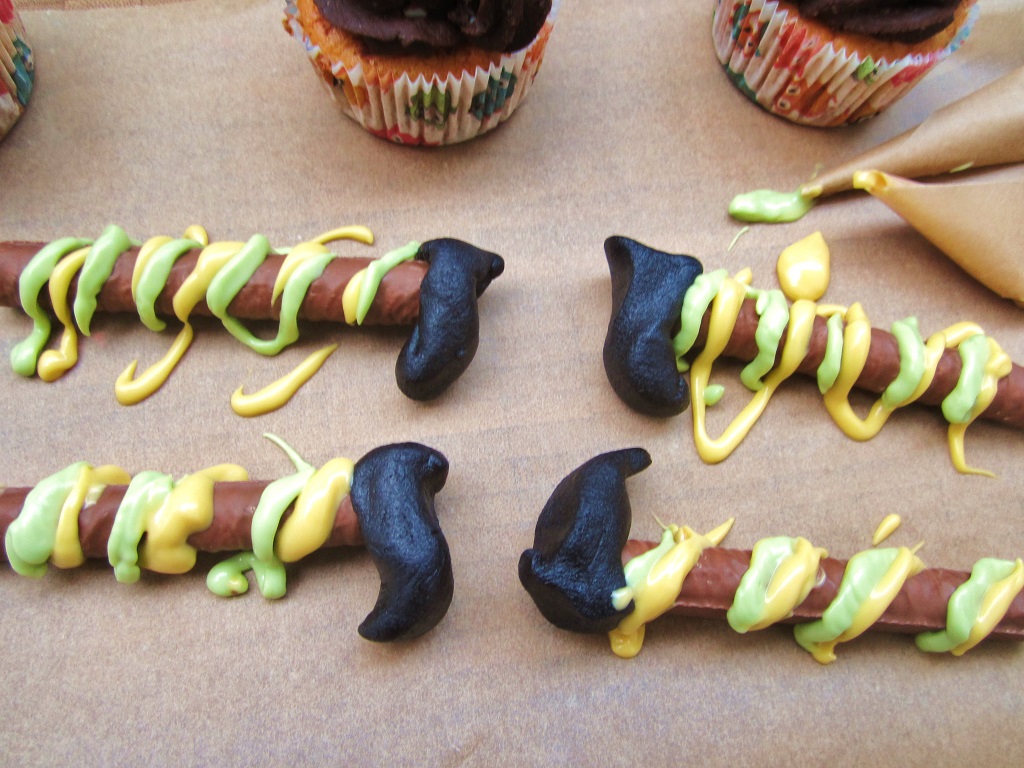 Nichtsahnend bin ich also am Backen von Chocolate-Chip Cupcakes mit Schokoladenganache, als plötzlich eine handgroße Hexe in der Küche rumspringt. Ich renne also ins Wohnzimmer, um eine Kamera zu holen (sonst glaubt einem das ja keiner) und als ich wieder kam, hab ich nur noch die Füße gesehen, die aus dem Cupcake steckten. Fand das ein bisschen frech. Weitere Ideen für Kuchen rund um Halloween sind zum Beispiel die Spinnennetz-Cupcakes, Kürbiscupcakes, Marzipan Kürbisse, die Fledermaus-Cupcakes und die fetten Kellerspinnen.