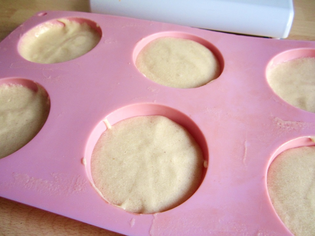 4.) Teig in halbrunde Formen bis kurz unter den Rand gießen. Für 20-25 Minuten backen.