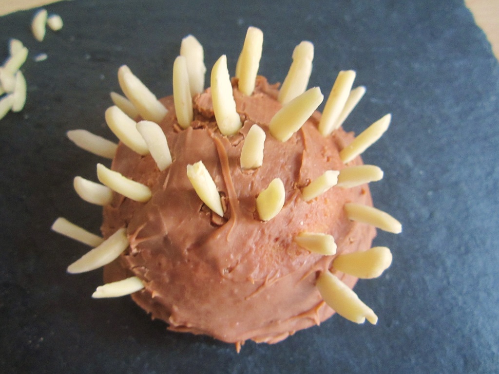 2.) Die Mandelstifte rundherum in das Küchlein stecken, eine kleine Fläche für das Gesicht frei lassen.