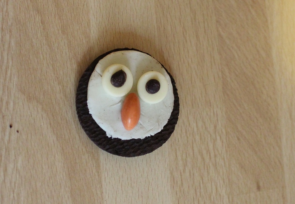 2.) Die Schoko- oder Zuckeraugen auf den Oreo mit Creme drücken.