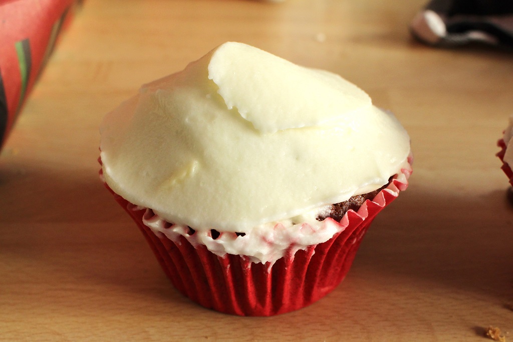 Die kleinen Zuckerstangen habe ich übrigens von Depot. Wer hätte das gedacht. Und strenggenommen ist es auch ein totaler Betrug die Dinger „Haselnuss“-irgendwas zu nennen. Ich wollte Haselnüsse rein machen, hatte aber keine mehr. Die habe ich alle für meine Rocky-Road genommen. Also habe ich improvisiert und einen fetten Löffel Nutella reingepackt. Da ist ja auch immerhin 15 Prozent Haselnuss drin (auch wenn man sich Sorgen machen darf, was die anderen 85 Prozent sind). Aber wenn die Geschäfte geschlossen haben, dann soll man nicht wählerisch sein. Vielleicht noch ein Wort zum Frischkäse-Icing: Es ist sehr sehr süß. Es ist ein englisches Rezept von dem Cupcake-Shop „The Hummingbird Bakery“. Macht das Icing deshalb nicht allzu dick auf den Muffin. Die Cupcakes selbst sind allerdings auch nicht so wahnsinnig süß, in der Kombination ist es also sehr lecker. Und das Icing härtet im Gegensatz zu meinen anderen ein wenig aus und hat damit eine tolle Optik und Haptik. Wenn ihr zu einem etwas deutscheren Rezept möchtet, dass nicht so süß ist und mehr nach Frischkäse schmeckt, dann versucht doch mal dieses hier.