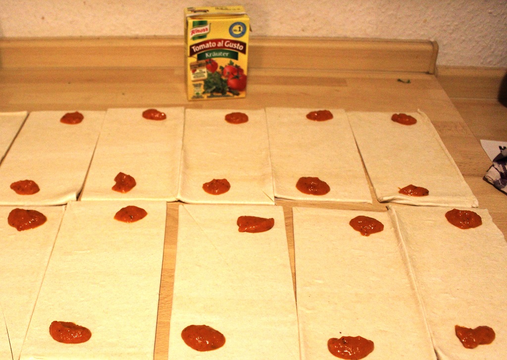 2.) Die Blätterteige-Scheiben diagonal in je zwei Dreiecke schneiden. Auf jedes Stück ein wenig Sauce geben und mit einem Löffel grob verstreichen.