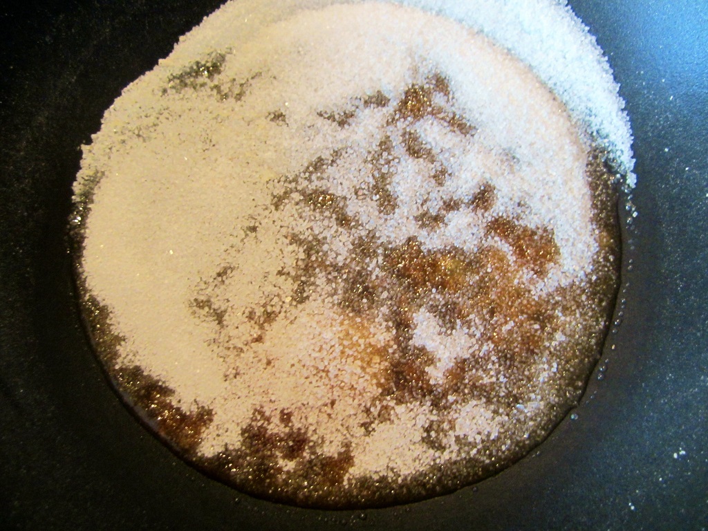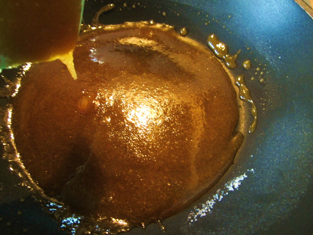 2.) Der Zucker wird glasig. Dann anfangen zu rühren. Dann wird er schnell honigfarben. Sobald ihr eine dunkle Honigfarbe erreicht habt und keine Klumpen mehr drin sind, gießt ihr unter sie Sahne auf das Karamell, in kleinen Schlücken und unter ständigem Rühren.