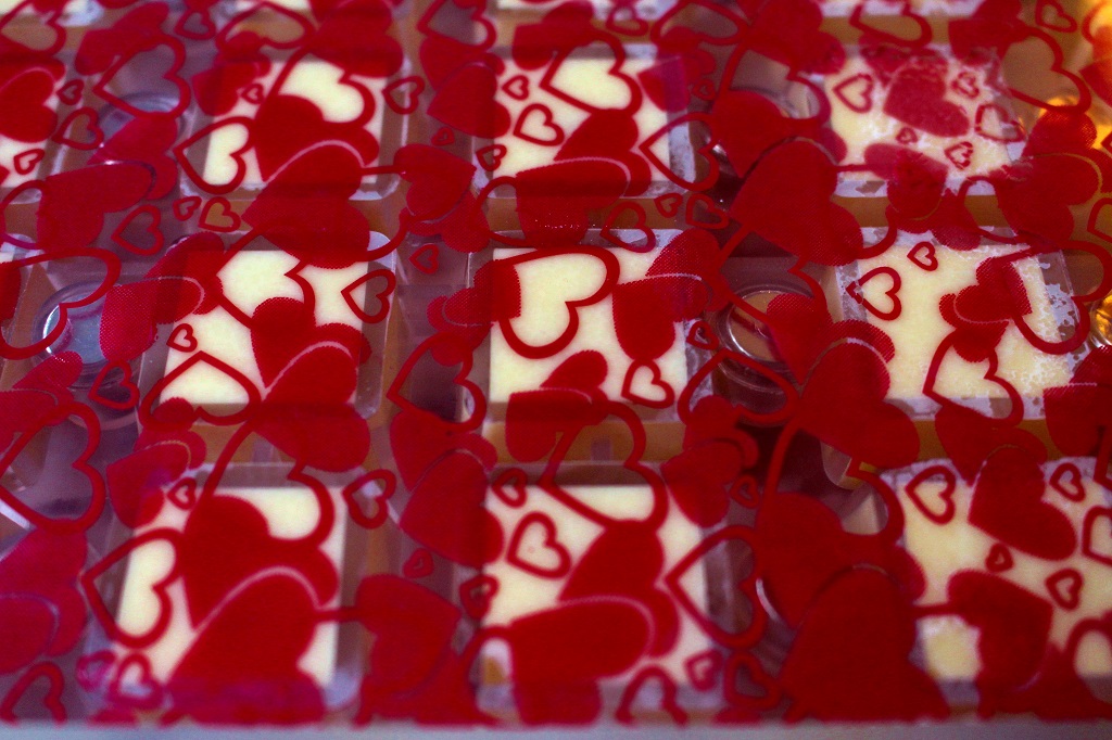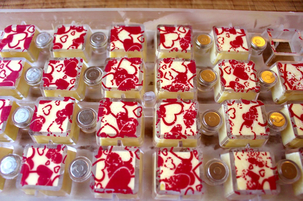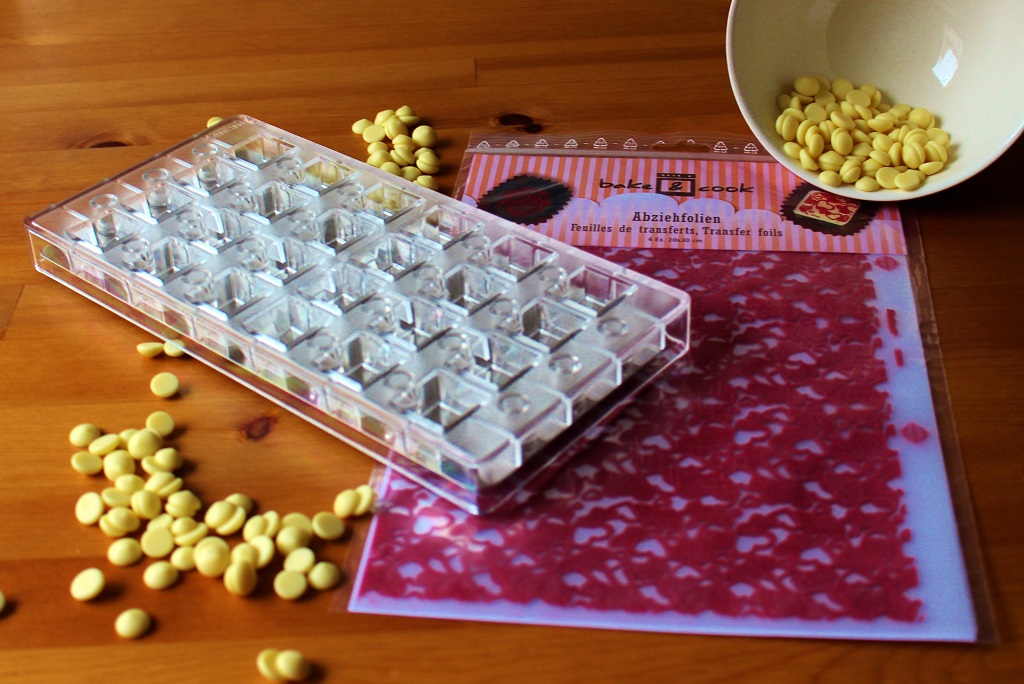 Mensch, so viel Neues! Ich bin ja schon letzten Sommer so ein bisschen ins Pralinen-Business eingestiegen und habe mit einer Silkonform experimentiert. Aber jetzt habe ich mal investiert und mir eine Magnet-Form gekauft. So was Verrücktes. Der Boden der Form ist abnehmbar und wird magnetisch fixiert. Damit man eine Transferfolie einlegen kann. Das sind Folien, die mit essbarer, gefärbter Kakaobutter bedruckt sind. Wie bei einem Abzieh-Tattoo hat man das Design hinterher an der Schokolade. Sieht ziemlich schick aus und ist gar nicht schwer. Ist das erste Mal für mich mit a) weißer Schokolade für Pralinen b) Transferfolie für Pralinen und c) mit der neuen Magnetform. Während ich mir verschwörerisch die Hände reibe sage ich deshalb: Ich liebe es, wenn ein Plan funktioniert!