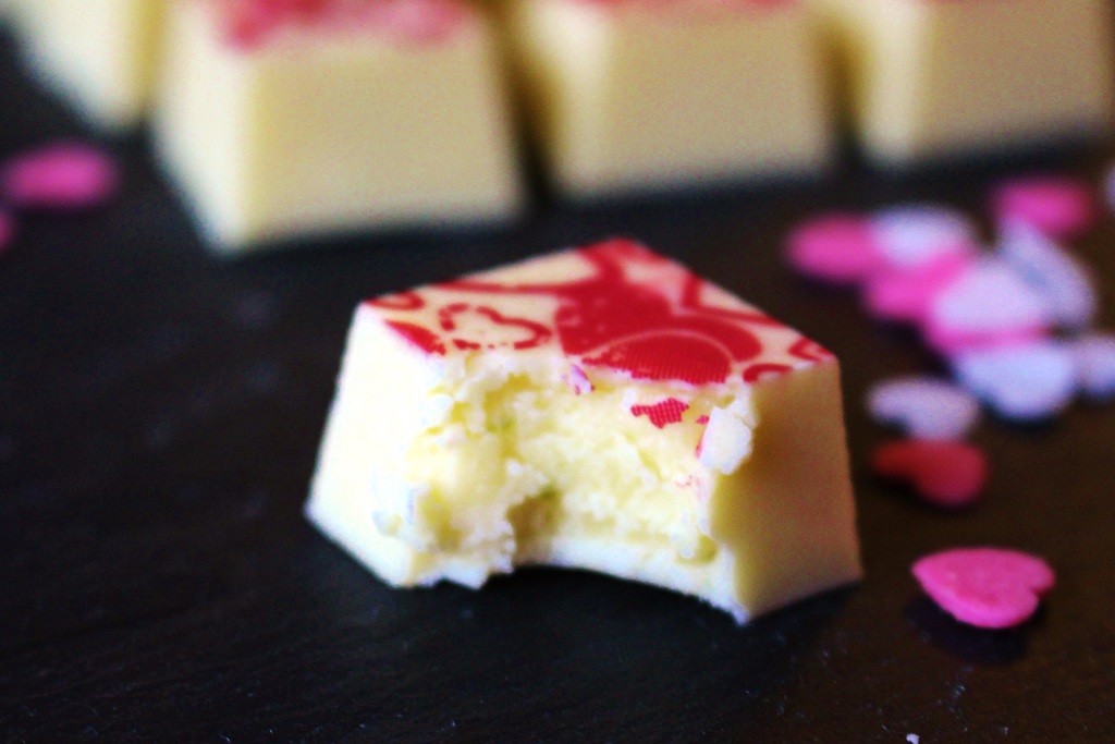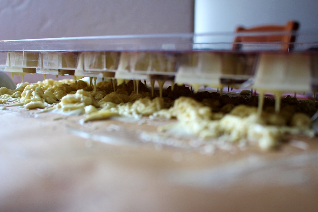 6.) Die Form aus dem Gefrierfach nehmen und die weiße Schokolade darauf verteilen. Mit einem Messer oder einem Spaten glatt ziehen, sodass sich die Schokolade nur in den Kammern sammelt und die Praline abdeckt. Mit einem sauberen Messer nochmal drüber ziehen. Das macht die Reinigung hinterher einfacher und die Böden der Pralinen schöner. Die Form nochmal für eine halbe Stunde in den Kühlschrank. (siehe Foto unten)