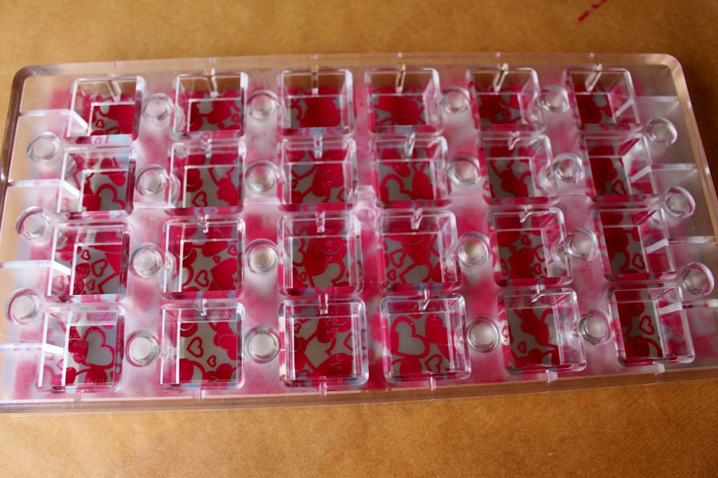 1.) Die Magnet-Form für Pralinen öffnen und das Stück Transferfolie entsprechend zuschneiden. So einlegen, dass die raue Seite mit der Schokolade in Berührung kommt. Die Form schließen. (siehe Foto unten)