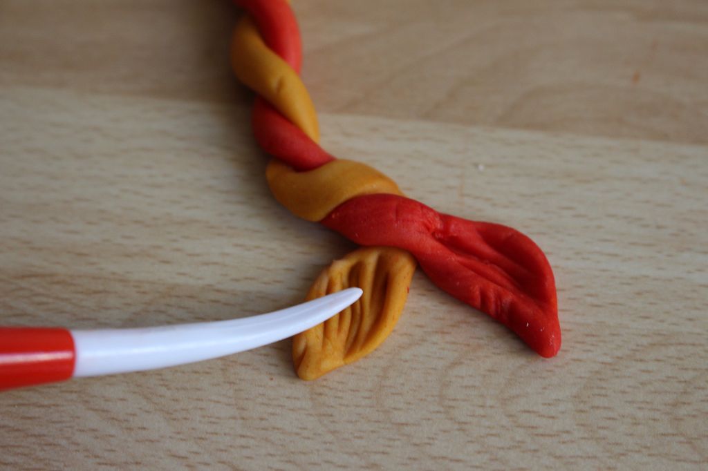 - The bookmark: Roll the yellow and red fondant into thin sausages and twist them with each other. Use a small fork to create the end bits.