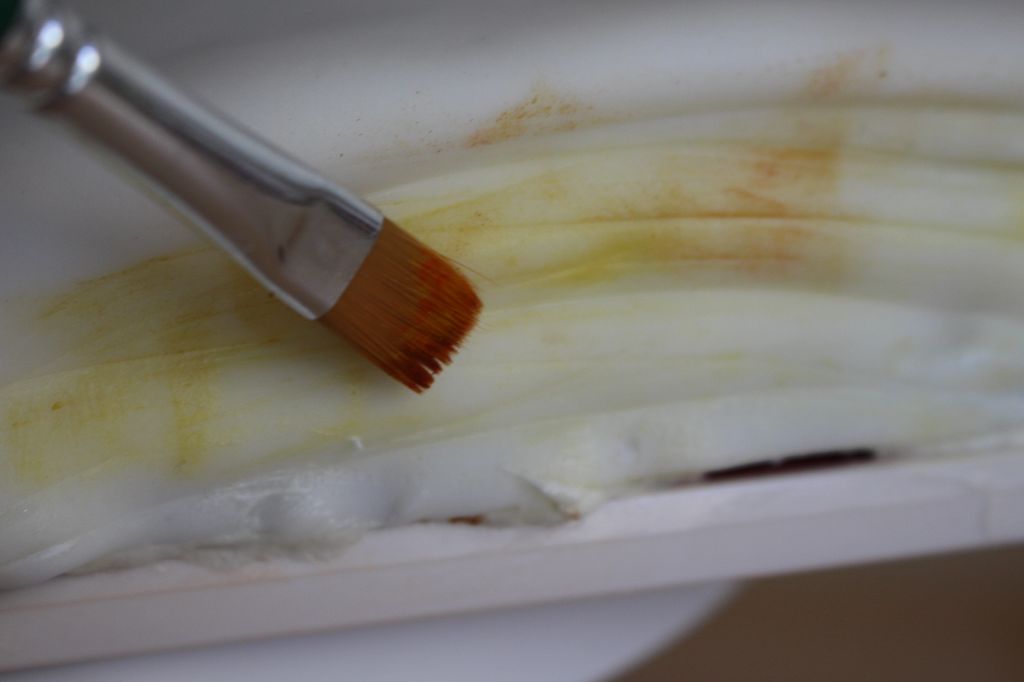 4.) The „antique“ look can be created with powdered food colouring or even a bit of cocoa powder. Use a clean brush with very little powder and spread it around and on the cake until you are happy with the result. Remember – less is more!