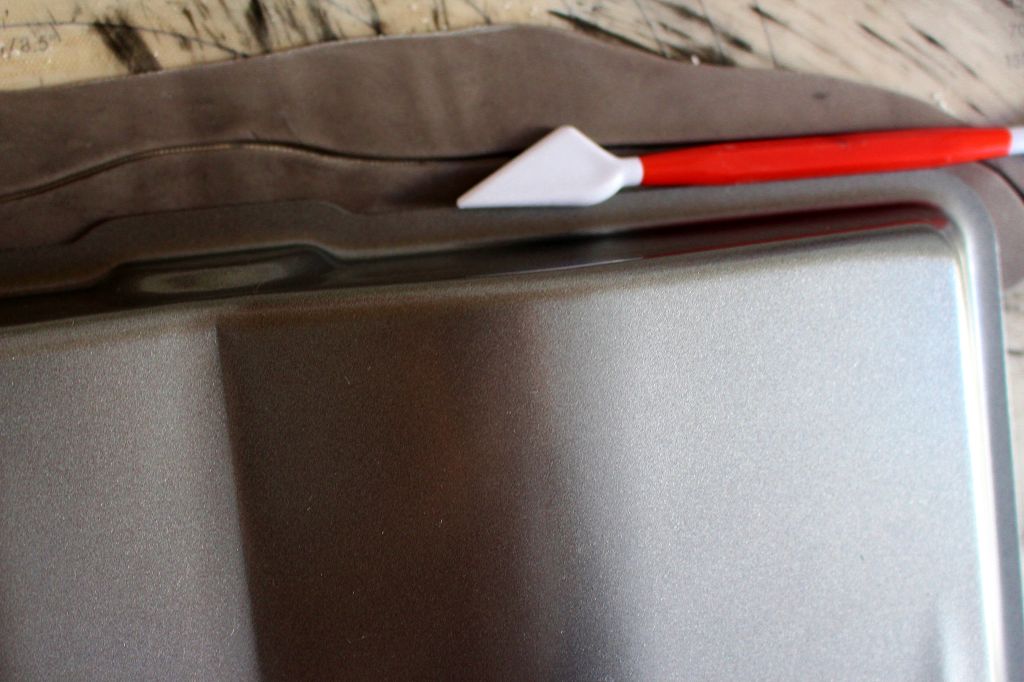 3.) The decoration: Knead the white fondant until soft and roll out very thin so it will cover the entire cake. If it’s sticky, use starch (not icing sugar). Carefully cover the cake with the fondant and smooth it out with clean hands. Cut off excess fondant. Now use the back end of a fork or spoon to mould page-like lines to the sites of the cake.