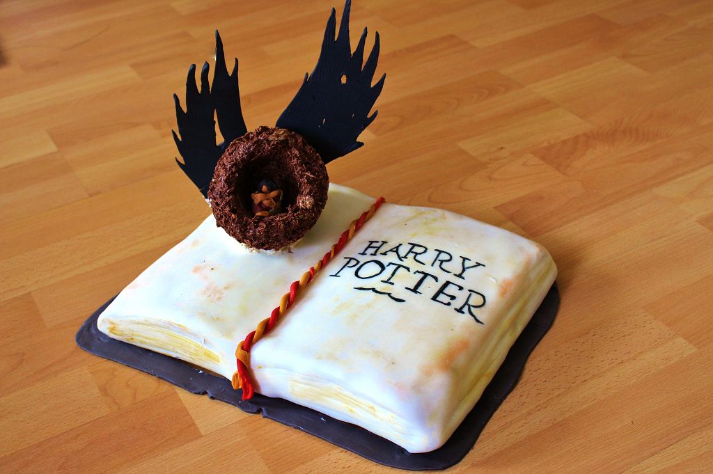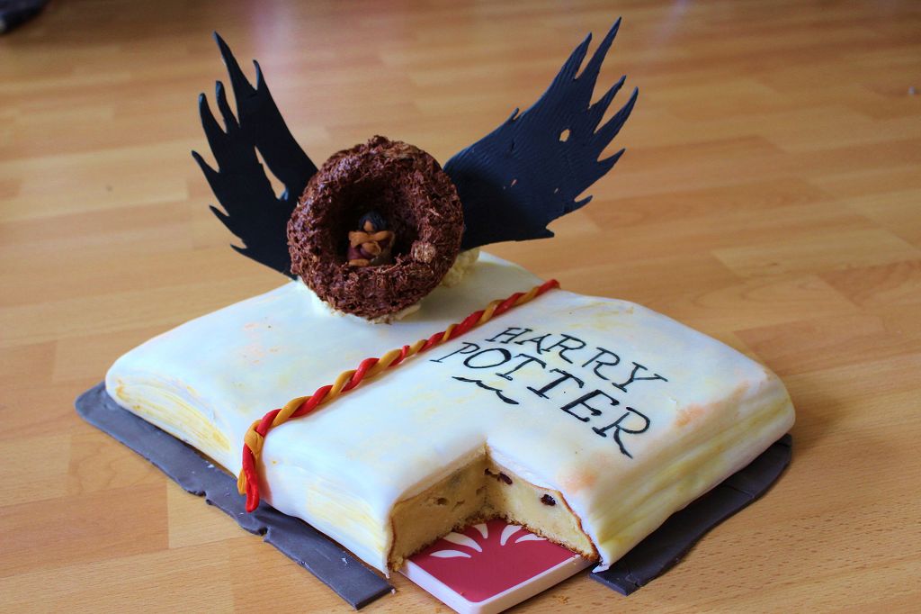 5.) Place the bookmark in the middle of the cake. Use the food colouring pen to write „Harry Potter“ on one page (use a toothpick to pre-write it to get it right) and use the cream you set aside earlier to glue the nest with the figurine inside on the other side of the book. Now carefully stick the wings with the toothpicks first in the cake right behind the nest. Mischief managed! (or just: we are done here!)