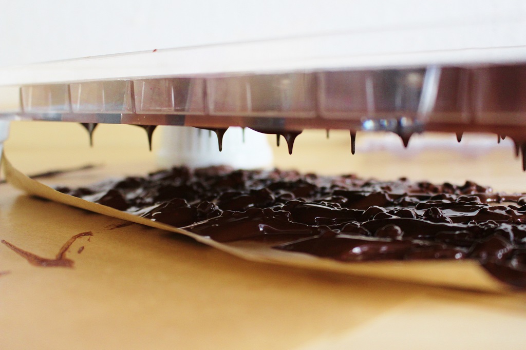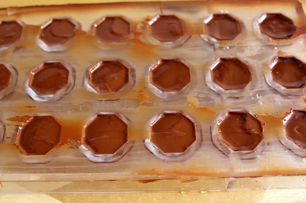 1.) Die Schokolade klein brechen und bei geringer Wärmezufuhr im Wasserbad schmelzen. Auf die Pralinenform schütten und gut verstreichen, bis alle Kammern mit Schokolade gefüllt sind. Mit einem großen Messer oder Spachtel sauber über die Form streichen. (siehe Foto unten)