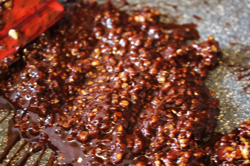 2.) Die Nüsse ohne Fett in einer Pfanne goldbraun anbraten. 3 EL Ganache dazu und das ganze gut verrühren. Komplett auskühlen lassen.