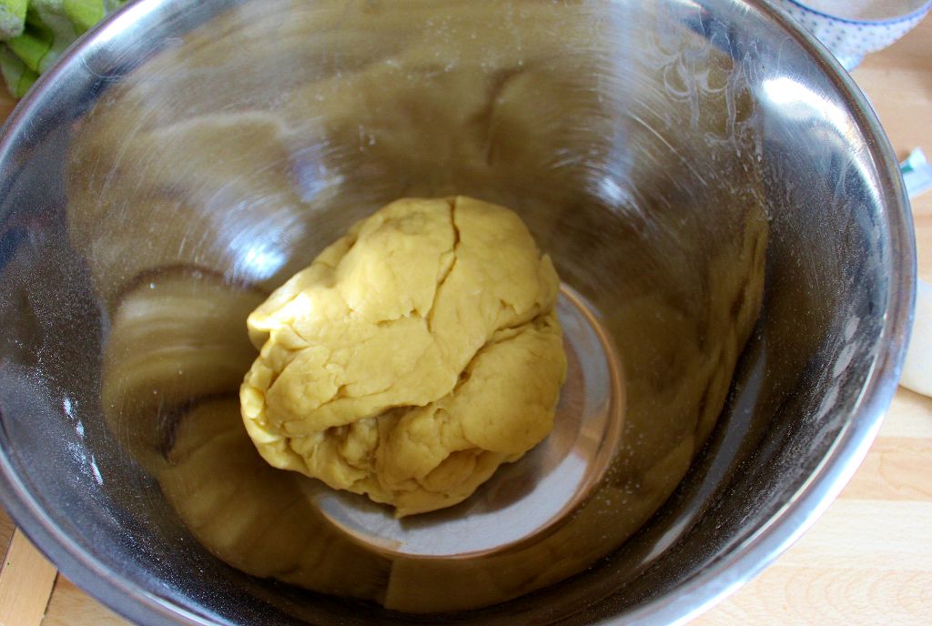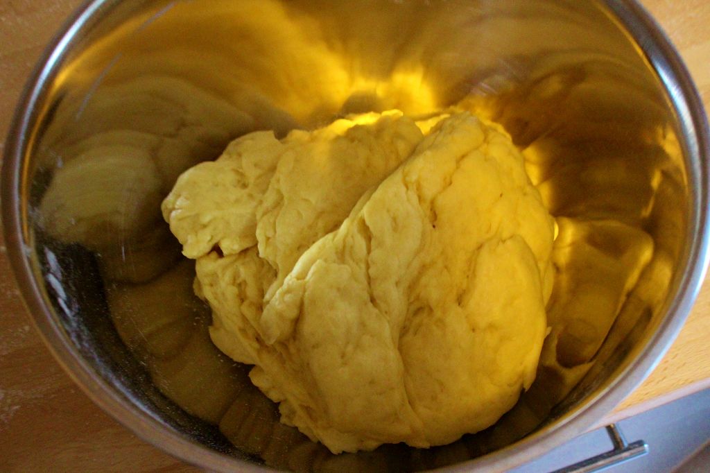 - Mehl und Trockenhefe gut vermischen. Zucker, Eier und die warme Margarinen-Milch dazu geben und mit einem Knethaken erst langsam und dann schneller 3-4 Minuten kneten. Geht auch super mit den Händen.