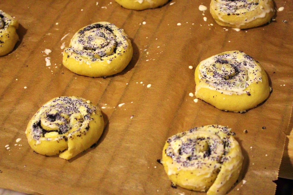 - Die Schnecken auf ein mit Backpapier ausgelegtes Backblech legen (Abstand lassen, sie gehen auf). Mit einem Küchentuch abdecken und an einem Warmen Ort nochmal gehen lassen, bis sich die Schnecken vergrößert haben (bei mir etwa 20 Minuten). In der Zwischenzeit den Ofen auf 180°C vorheizen.