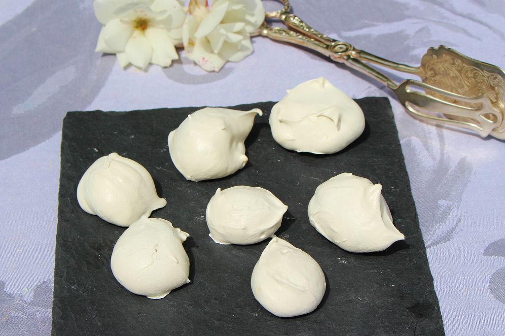 4.) Die Masse ist nun fertig und ihr könnt sie auf ein mit Backpapier ausgelegtes Backblech geben. Ich spritze sie gerne in einem Beutel mit großer Lochtülle auf, aber ihr könnt auch einfach zwei Löffel nehmen und Häufchen machen. Ihr braucht nur wenig Platz zwischen den Baisers lassen, da sie nicht aufgehen.