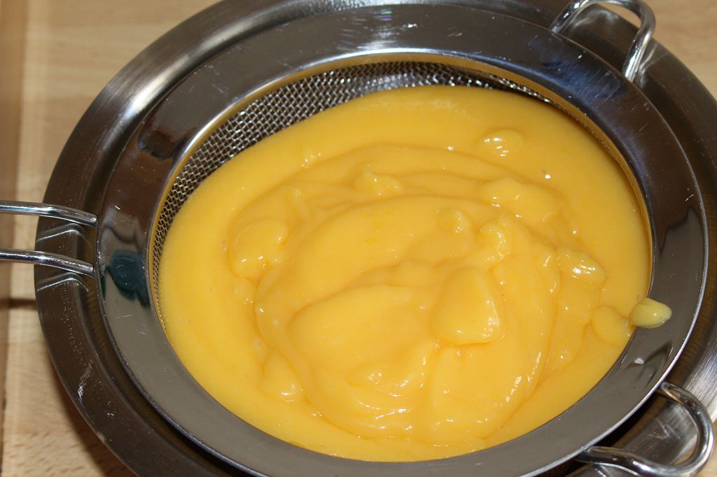 3.) Wenn ihr eine Pudding artige Konsistenz erreicht habt und es schön heiß ist, gebt ihr die kalte Butter hinzu. Diese kühlt euer Curd erstens ab und zweitens macht sie es cremig und streichbar. Gut rühren und noch heiß durch ein Sieb streichen. Das zieht Stückchen (z.B. von der Zitrone) raus und schon ist es fertig! Im Kühlschrank hält es sich etwa zwei bis drei Tage.
