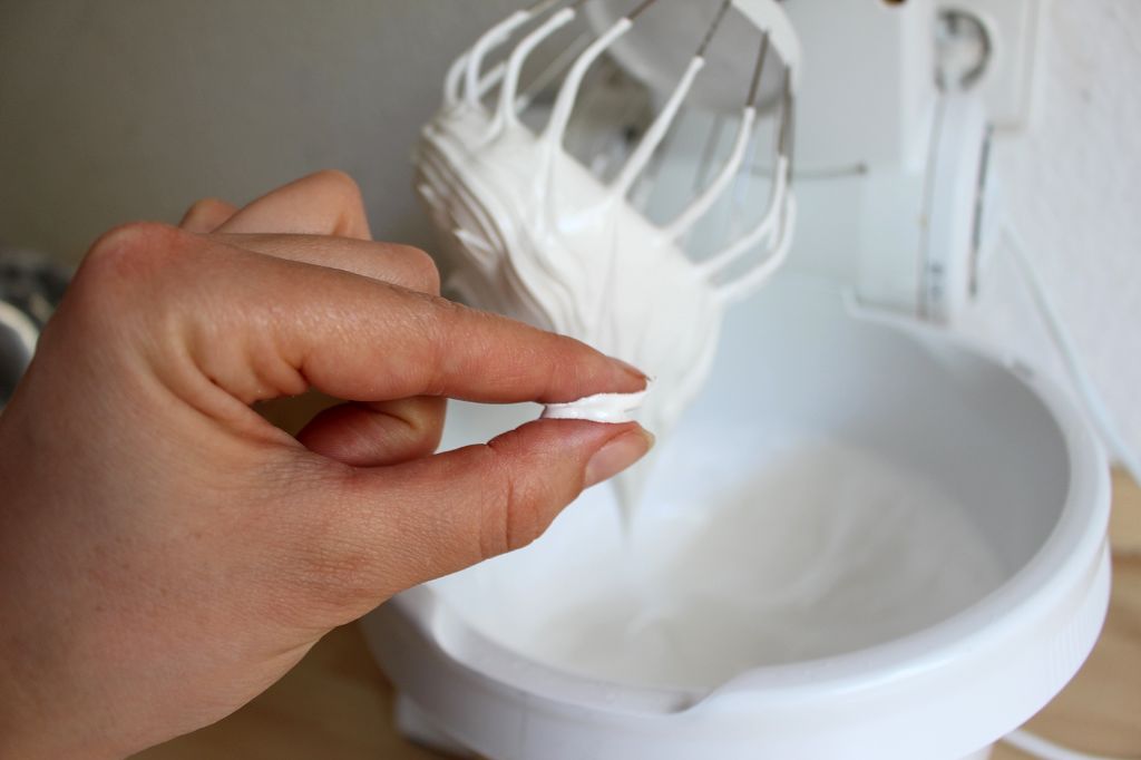 - Das Eiweiß muss sehr lange auf höchster Stufe gerührt werden. Aber anfangen solltet ihr auf mittlerer Stufe. Indem ihr langsam eine Struktur aufbaut, wird das Eiweiß stabiler und fällt nicht ein.