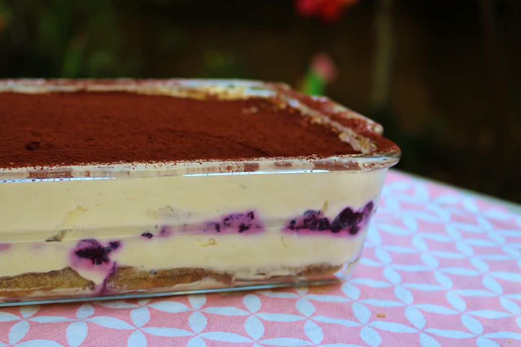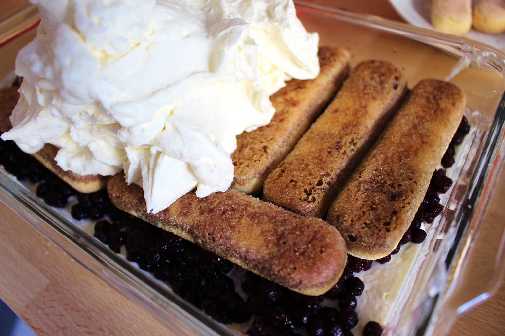 3.) Die Löffelbiskuit mit der zuckrigen Seite für 1-2 Sekunden in den Blaubeerespresso tunken und sie dann mit der feuchten Seite nach oben in die Auflaufform legen, bis sie voll bedeckt ist. Dann die Hälfte der Mascarpone-Creme auftragen und diese gut verteilen. Dann die Blaubeeren darauf verteilen und eine weitere Schicht getunkte Löffelbiskuit oben auf geben. Als Abschluss die restliche Mascarponecreme obendrauf verteilen und für mindestens 2 Stunden, besser über Nacht, in den Kühlschrank.