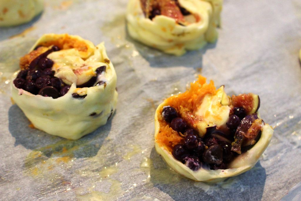 Und hier kommt mein eigenes Rezept. Dass ich etwas Süßes machen würde, war ja von Anfang an klar. Ich wollte aber gern etwas machen, was für euch auch neu ist, und was ich so noch nicht auf meinem Blog habe. Deshalb habe ich mich für einen Strudel entschieden, der in ungebackenem Zustand in kleine Schneckchen geschnitten und dann portionsweise gebacken wird. Hinein habe ich neben ein wenig Creme Fraiche mit Honig vor allem frische Feigen und Wilde Blaubeeren getan. Als Füllmittel habe ich Karottenraspeln verwendet und für den Wow-Effekt gab es noch ein paar kleine Schokotröpfchen hinein. Der Strudel geht super schnell, ist handlich zu essen und einfach köstlich.