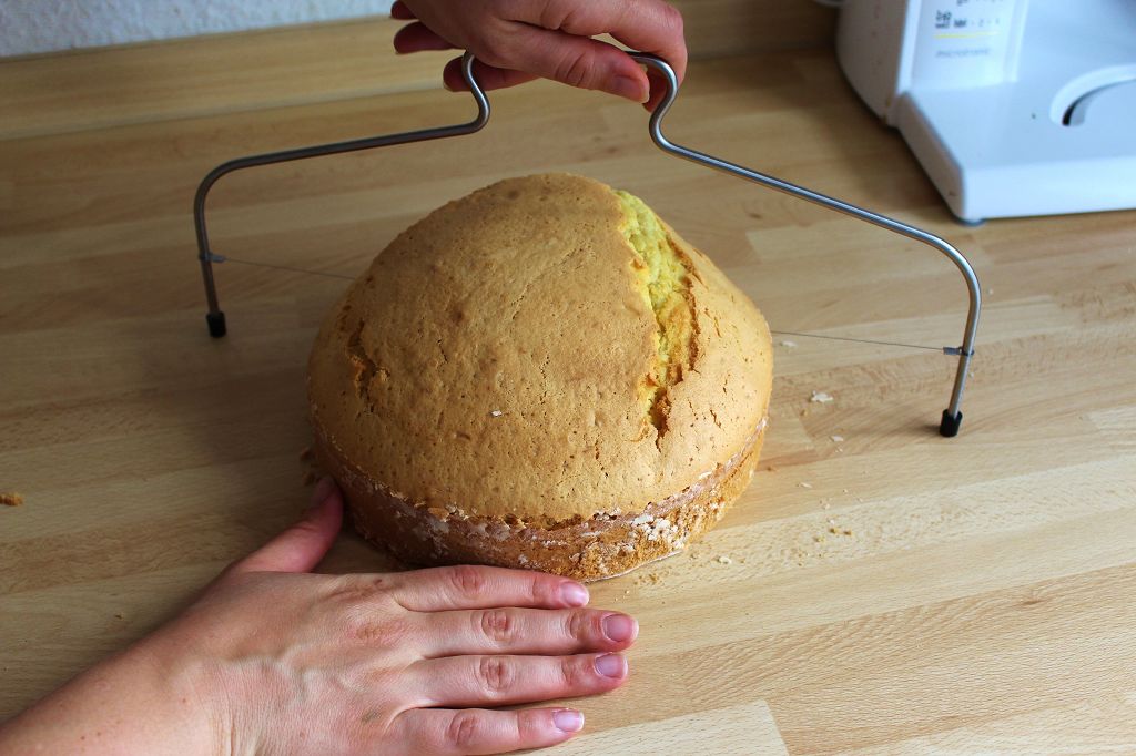3.) Den Kuchen vorsichtig aus der Form lösen und komplett erkalten lassen. Schneidet die Oberfläche oben glatt (manchmal bildet sich eine Kuppel) und teilt den Kuchen horizontal in gleich hohe Scheiben (z.B. drei). Ganz unten  im Beitrag gibt es Ideen, was ihr mit den „Resten“ des Biskuit machen könnt.