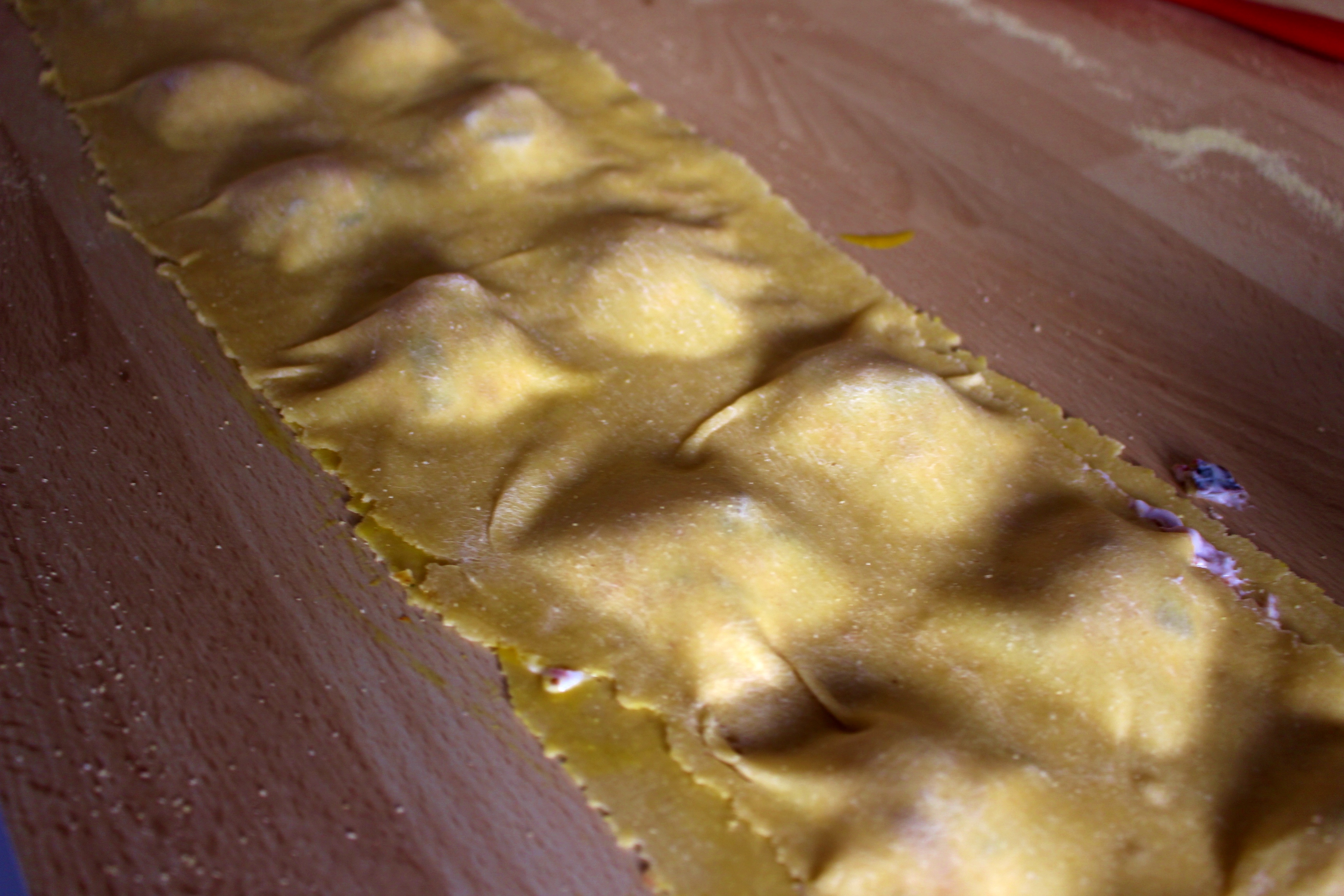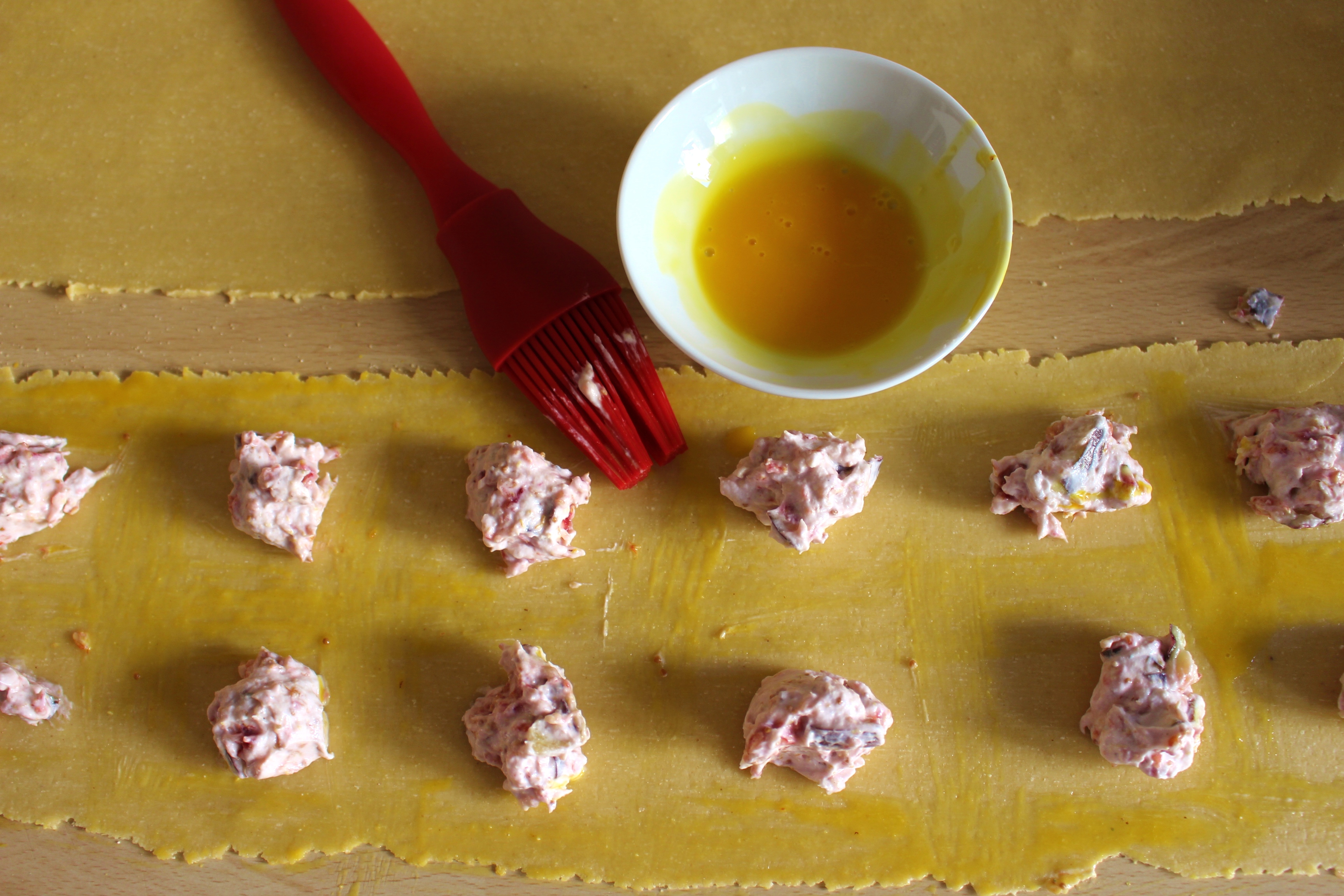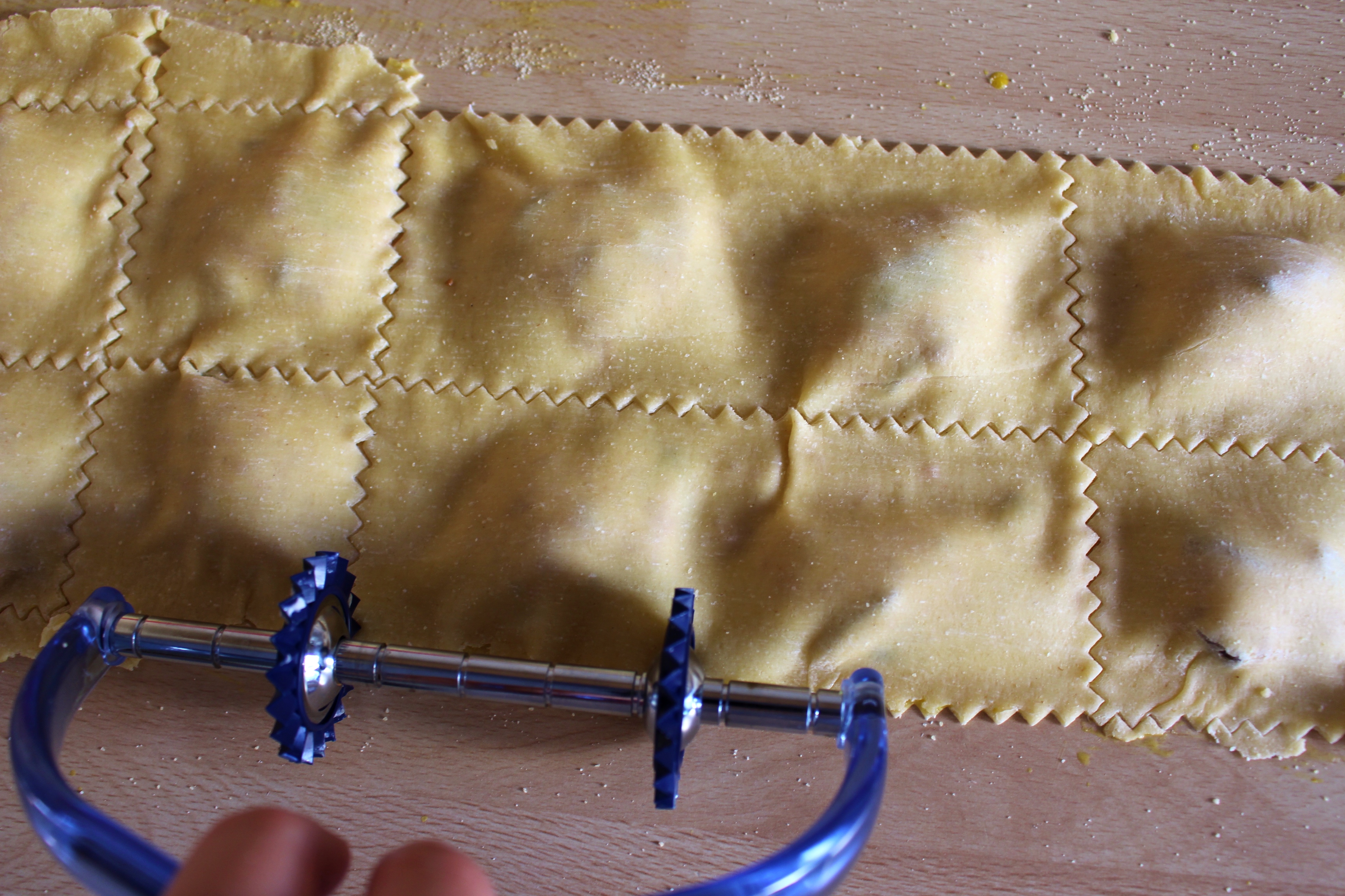5.) Ein weiteres sehr sehr dünnes Pastaband auf die Füllung legen – wer möchte, kann vorher Eigelb rings um den unteren Nudelteig verteilen, damit die Nudeln besser zusammenkleben beim Kochen. Gut andrücken und darauf achten, dass keine Luft in den Kammern bleibt. Die Nudeln mit einem Messer (oder einem geriffelten Pasta-Schneider) in die gewünschte Form schneiden. (Jetzt sind die Nudeln bereit zum Kochen, aber wir machen vorher die Salbeibutter.)