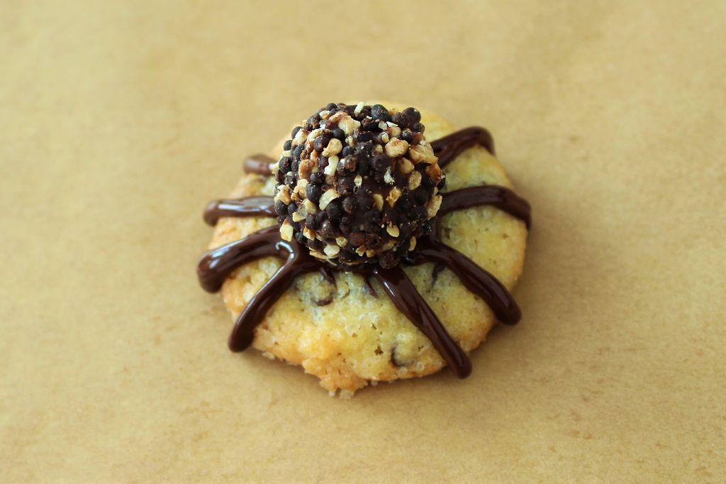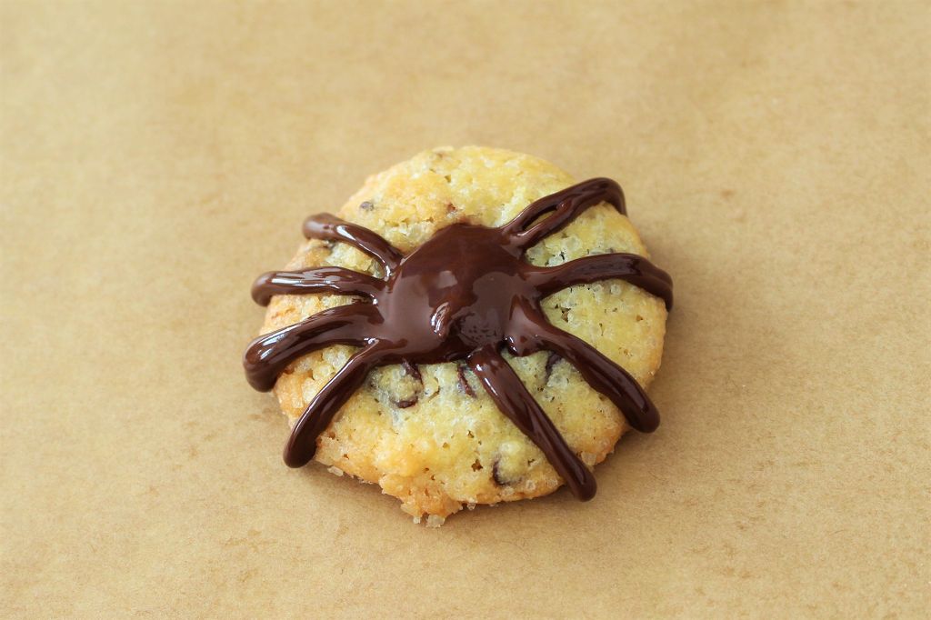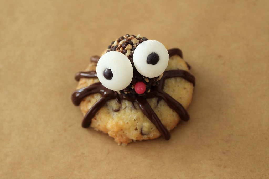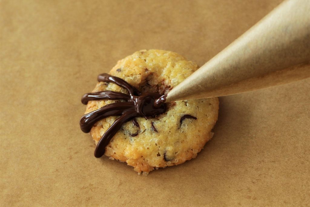5.) Die Schokolade schmelzen und mit einem Spritzbeutel acht kleine Beine auf die Kekse malen. Solange die Schokolade flüssig ist, die dunklen Kugeln darauf setzen und bei Bedarf Augen anbringen. Fertig!
