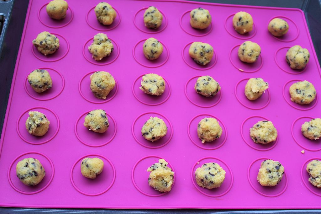 3.) Ein Blech mit Backpapier belegen. Den Teig in kleine Kugeln formen und mit genug Abstand auf das Blech legen. Ihr braucht sie nicht plattdrücken, sie zerlaufen und werden rund.