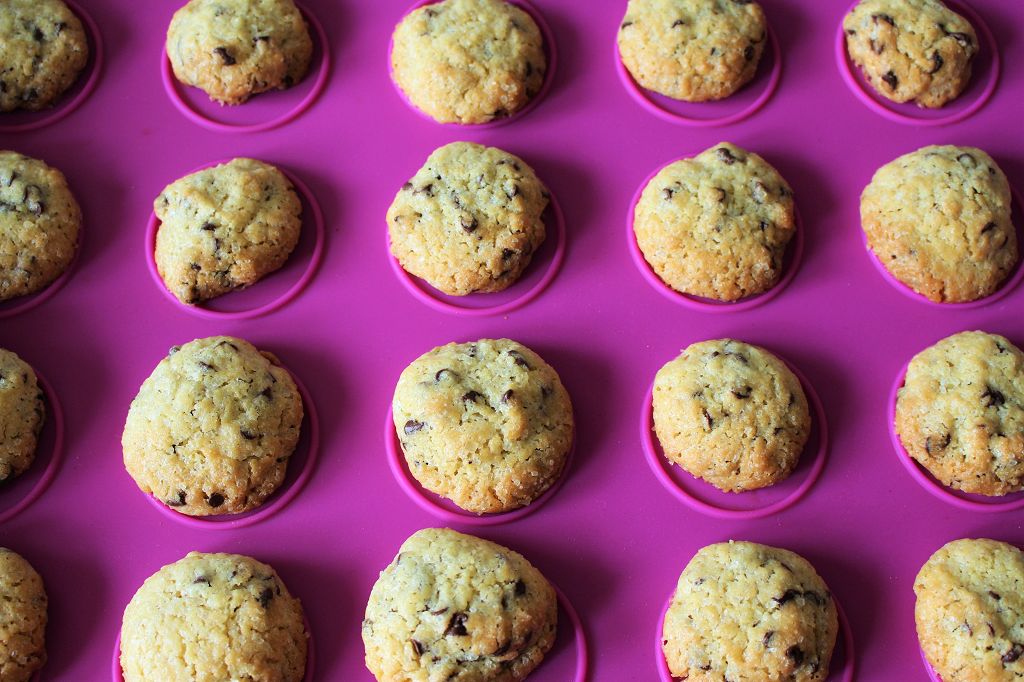 4.) Kekse für ca. 10 Minuten im vorgeheizten Backofen bei 180° C backen. Die Kekse sind fertig, wenn sie einen dezenten braunen Rand bilden. In der Mitte müssen sie noch sehr weich sein – das härtet mit dem Abkühlen aus. Die Cookies nicht warm vom Bleck lösen. Mit den Schokokugeln oder dem Ende eines Kochlöffels kurz in die Mitte eine Mulde drücken und abkühlen lassen.