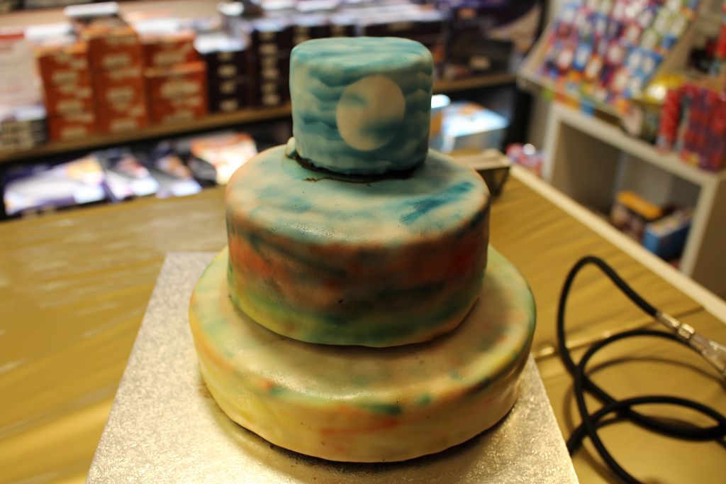 Das Airbrushgerät* wurde am Anfang von vielen Zuschauern mit Ehrfurcht beäugelt, aber der Künstler und der Spieltrieb in jedem von uns kam dann ziemlich schnell raus und jeder durfte mal mitmachen. Nur die oberste Wolkenschicht hab ich dann allein gemacht. Wir haben zuerst die unterste Kuchenschicht gelb besprüht, dann im Übergang zur zweiten etwas rot, wie ein Sonnenuntergang. Hier ein einfacher Trick für die Wolken und den Mond: Klebt ein Stück rundes Fondant dahin, wo der weiße Mond bleiben soll, bevor ihr lossprüht. Am Ende könnt ihr das abziehen und nur noch Akzente setzen.