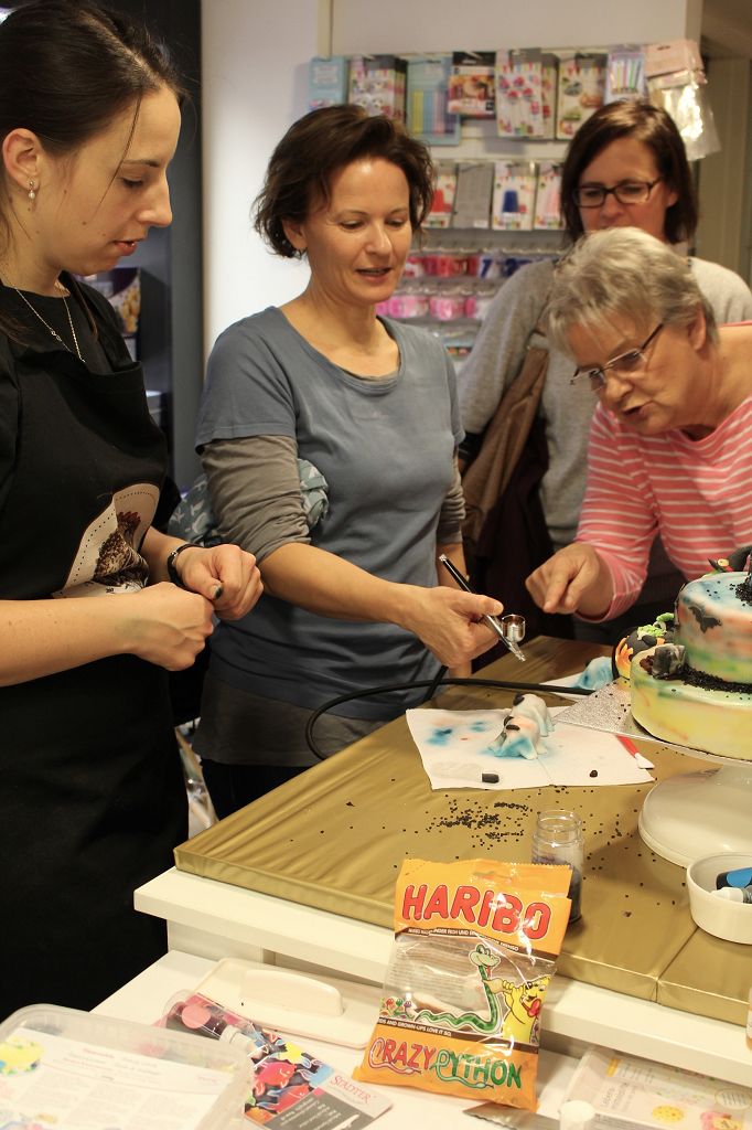 halloween-torte-airbrush-6Letzten Samstag konntet ihr einen Blick hinter die Kulissen maines Backens (ha-ha) werfen und mich in Aktion erleben – bei einer dreistöckigen Halloween Torte. Dabei habe ich euch gezeigt, wie man eine Torte in Fondant einschlägt, wie man frei Hand und mit Schablonen Figuren und Tiere modelliert und wie man mit Airbush einer Torte den letzten Schliff verleiht. Das ganze passierte zentral in der Frankfurter Innenstadt bei Lorey nahe der Hauptwache. Wie ihr vielleicht von Facebook wisst, habe ich hier alle paar Wochen einen Samstag, an dem ich euch Rezepte von meinem Blog backe: Zum Mitmachen, zum Zuschauen, zum Probieren, zum Quatschen. Ich bin total happy darüber, denn es gibt mir die Möglichkeit mich persönlich mit euch auszutauschen und Fragen zu beantworten. Außerdem ist es natürlich ziemlich genial in dem Laden zu backen, der bei weitem die beste Auswahl in Frankfurt und im Umkreis hat – falls mir mal was ausgeht 😉