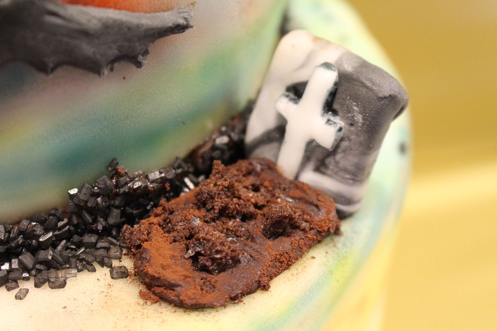 Rest in Keks: Das Grab ist ein wenig Ganache mit Kakao und Kuchenkrümmeln sowie einem Keks, der mit weiß und schwarz vermischten Fondant überzogen ist.
