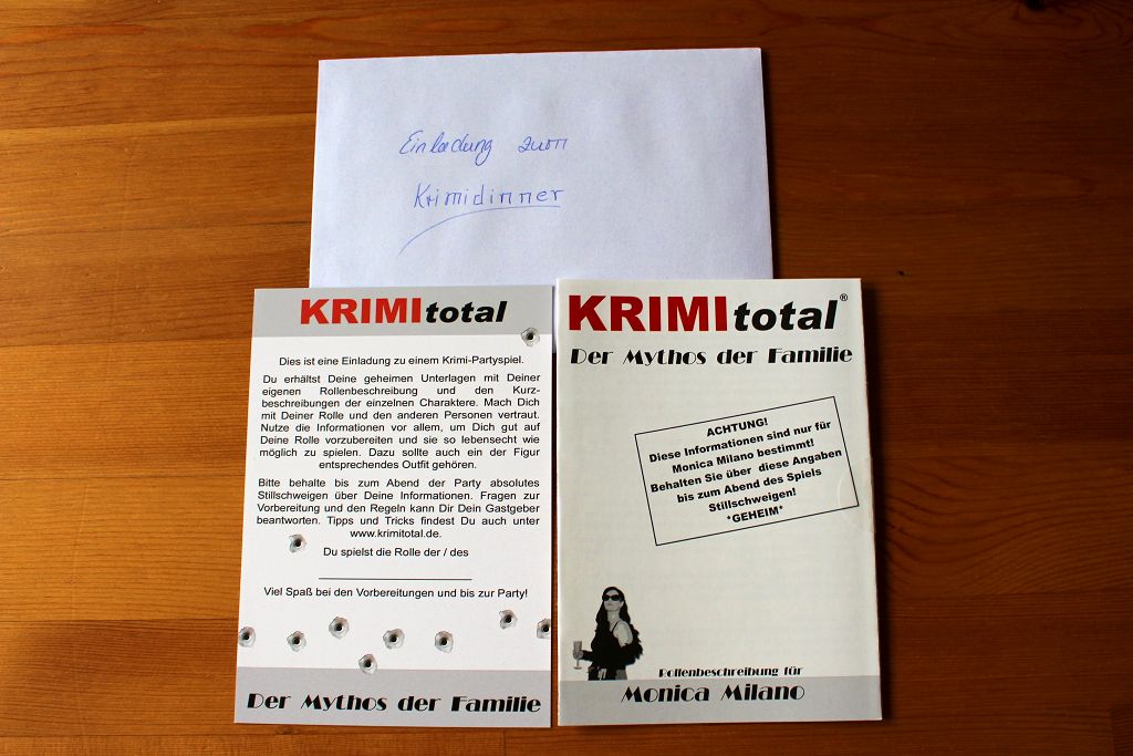 Schritt 4: Verschickt die Einladungen. Im Spiel enthalten sind Einladungskarten und ein kleines Heftchen für jeden Spieler, das mehr (geheime) Informationen zur eigenen Rolle gibt. Auch der Gastgeber behält eine Rolle. Ich verschicke die Einladungen gerne per Post (oldschool). Es gibt der Sache irgendwie nochmal einen besonderen Touch… und mal ehrlich – jeder kriegt gern Post, die keine Rechnung ist! Die Spieler sollten ein paar Tage Vorbereitungszeit haben, zwischen dem Brief und dem Dinner.