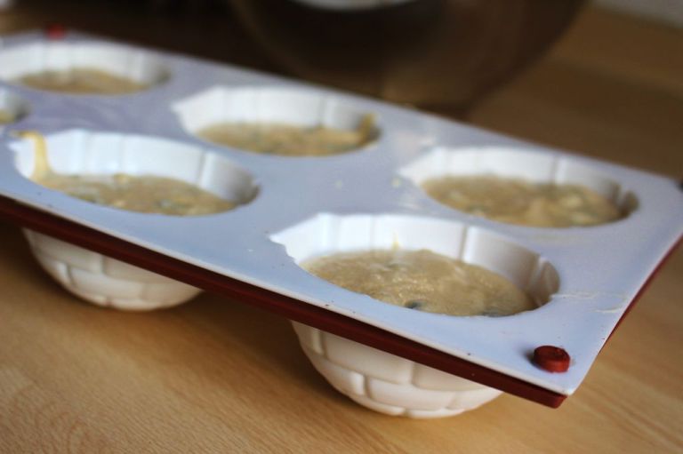 2.) In einer zweiten Schüssel Mehl (120g) und Backpulver (1 TL)gut mischen. Mit dem Gemisch aus Schritt 1 vermischen und nach und nach die Milch (80g) einrühren. Die Schokodrops (60 g) dazu rühren und den fertigen Teig auf sechs Silikonförmchen aufteilen. Im vorgeheizten Backofen für ca. 22 Minuten backen.