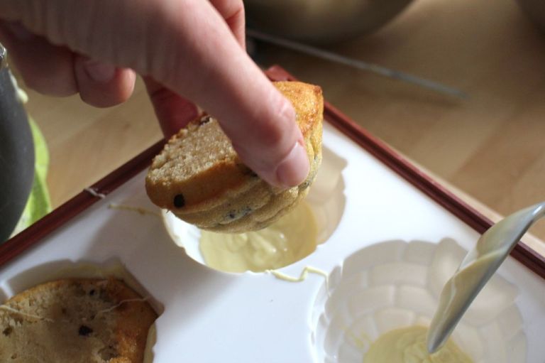 3.) Die fertigen Küchlein abkühlen lassen und aus der Silikonform lösen. Diese dann reinigen und abtrocknen, damit wir sie für die Glasur wieder verwenden können. Dafür die Schokolade (200g) im Wasserbad schmelzen.
