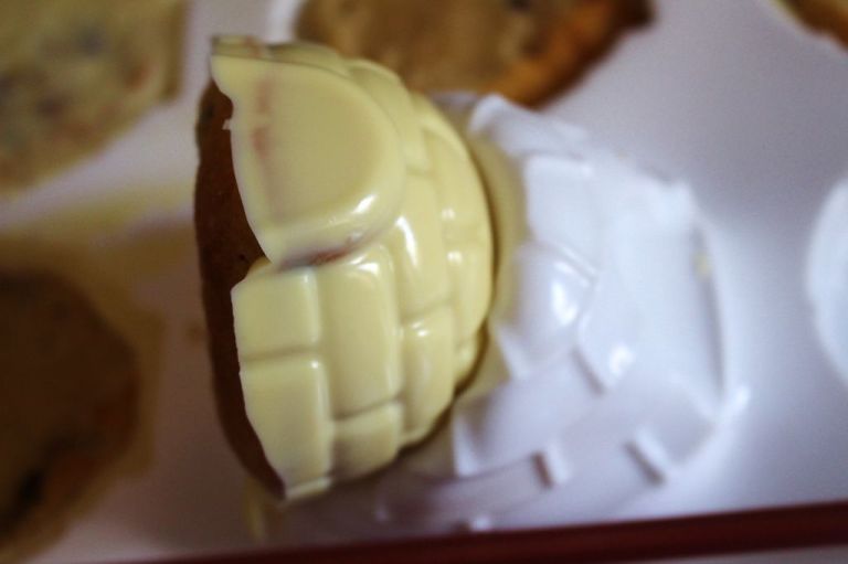 4.) Die flüssige Schokolade in den Förmchen verteilen, sodass jede zu etwa 1/4 oder sogar 1/3 befüllt ist. Dann die Küchlein in die flüssige Schokolade drücken, bis sie links und rechts oben raus kommt. So vollständig erkalten lassen und die Küchlein hinterher aus der Form lösen. Die Schokolade hat nun das Muster und die Form der Silkonform angenommen.
