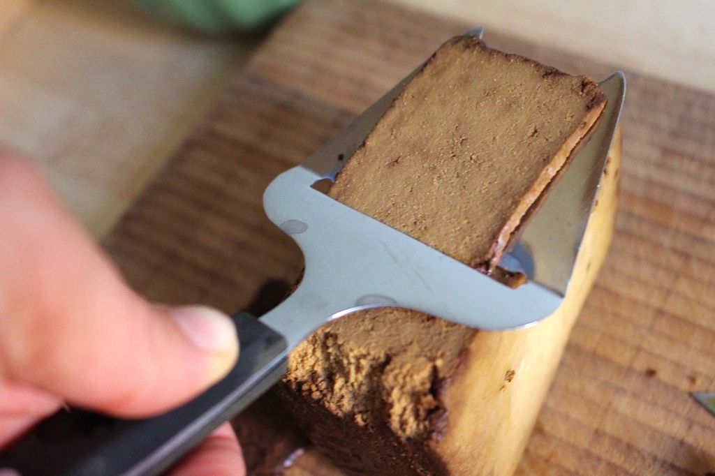 Räuchertofu gibt es in vielen Supermärkten, wie Alnatura oder Rewe. Er hat einen leckeren Geschmack, der Speck nahe kommt und ist ganz anders, als Natur-Tofu. Hier nutze ich einen Käseschneider, aber noch besser wird das Ergebnis mit einem Sparschäler.